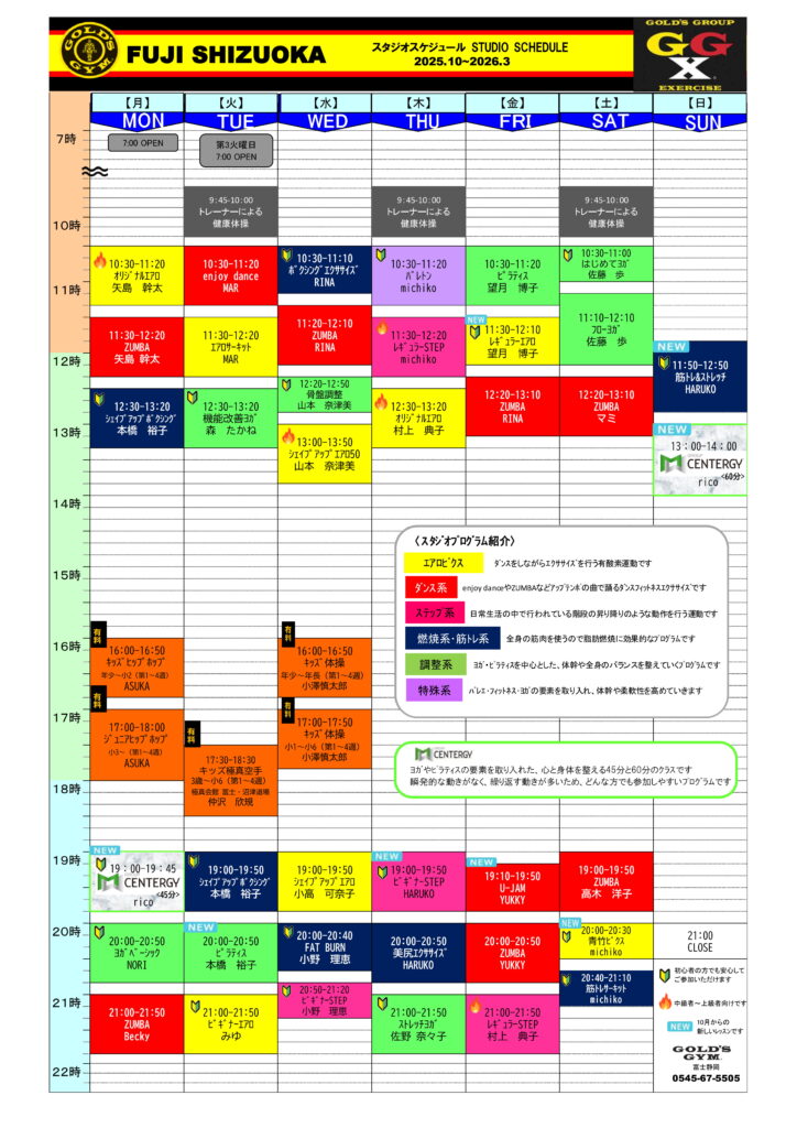 スタジオレッスン(詳細) ゴールドジム富士静岡ではスタジオエクササイズへの参加が可能です。ヨガのようなゆったりしたクラスから高強度有酸素運動まで幅広いプログラムと個性溢れるインストラクターが集結致しました‼︎ご参加お待ちしております!
